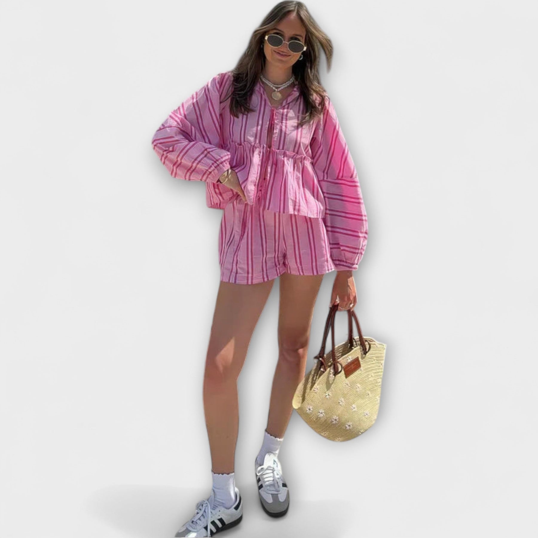 El conjunto de verano Rosita ofrece el equilibrio perfecto entre comodidad y elegancia. Su diseño liviano y transpirable lo hace ideal para días soleados, ya sea en vacaciones, en la ciudad o en un almuerzo relajado con amigos.